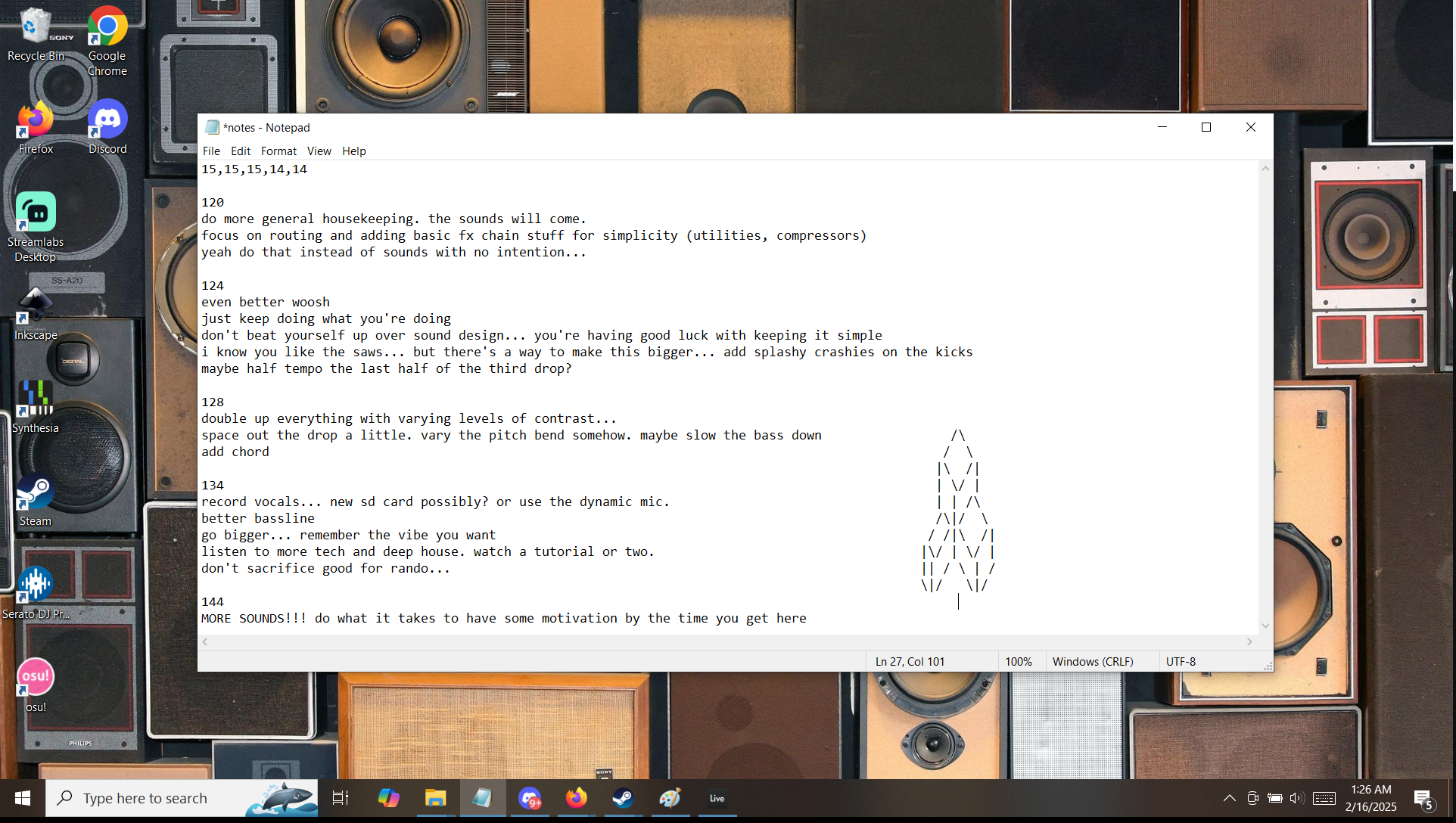 I’m also realizing that i’m in the “want to stay a kid forever” phase of making this ep. You see… this is really about immortality… at what point will these songs stop growing in a meaningful way? what’s 100 years compared to 1000? each spin around the record, adding a notch or taking one away… sometimes radically different, but relatively the same… Here we are at roughly 11 plays a piece. Trevor is not impressed… i am not impressed… children are not impressive… songs are not children… but i’d say three out of 5 songs have some sort of direction in life… 120 is going to switch up their style to impress the other songs. 128 is just a hot mess but i love em to death… 124 is got the rizz as they to say(songs, what are you gonna do?) 134 is a social butterfly and 144 is simply a dear… poor 144… all their samples got cut short but I’m gonna make them a new batch just as soon as i care enough… i cared a little… i also scrapped most of 120 to make way for big room noises… i tried to lay out a melody and got as far as the rhythm in tonic… seeing as how that’s “fine” to the untrained ear… i no longer have any idea how these notes were arranged in my head… it’s twelve notes! i have how many words i can type at whim? To some extent these writings make sense… and yet i’m writing the musical equivalent of “bread could food, bread could food, bread were good, hungry hungry hungry.” Plus, as is the case with going into anything with little experience, the more dug in i get, the harder it is to make big changes… 120 got hella moody on play 12 and i like it but the drops are simply too long… cutting them in half seems overboard but that would make the most sense… don’t call solomon