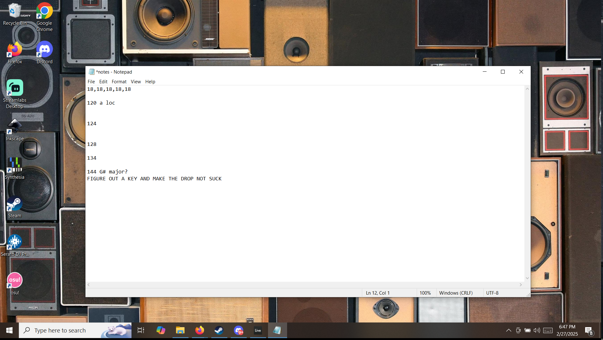 i did some housekeeping on 134 and then did some physical housekeeping while trying to find my sd card. No luck, so vocals will have to wait. I didn’t make any edits to the song as listening to it left me in awe of how much pot I’ve smoked since 2011… I’m breaking that one into two songs. The drop is insane in a “nobody would make this” kind of way and it does not match the vibe i’m going for at all. might be fun to bring the tempo down on what i have though… I was bored of housekeeping so you know what i did? I added an impact to 144… it’s trash… the song is at a place i like to call “fuck you for expecting better” but songs like that don’t sell records at this level of talent… Others can shit out wackiness and have it sound good… i don’t know my way around the knobs like they do… people make sample packs for this kind of thing. there’s also splice… I’m paying to much to keep my merch up as it is… so… sub to the patreon to keep this going… if i get enough subs to pay the bills, you won’t hear about dead people any more… for a while… there is some exclusive content but not as much as some would like…